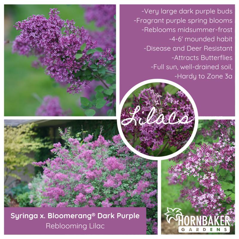 Dark purple buds open to fragrant purple blooms in the spring, then again in midsummer, continuing until frost. Grows into a round mound. If trimming is desired to control size, do so right after the spring bloom. Performs best in full sun. Slightly larger than the original Bloomerang® at 4-6' tall and wide. Hardy to Zone 3.