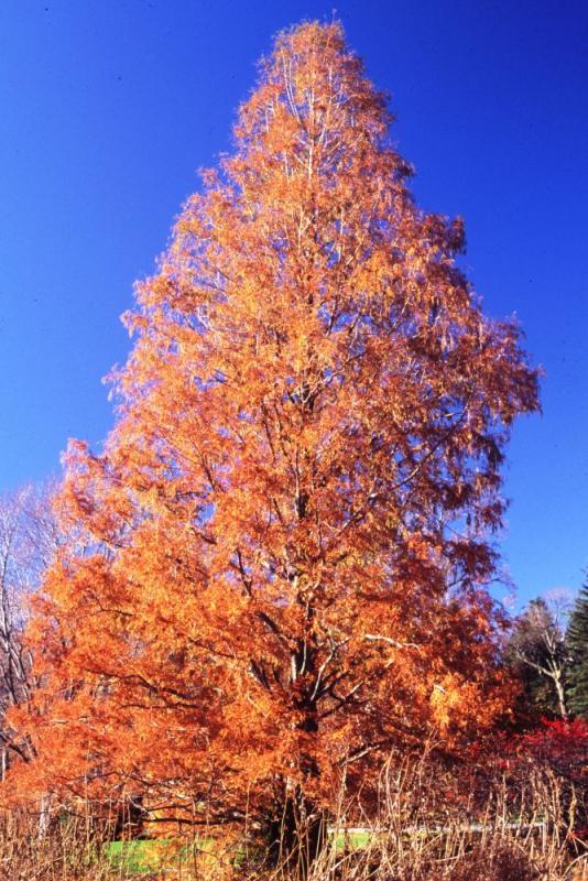 Dawn Redwood is a deciduous, hardier tree than its Sequoia cousin. It develops a handsome, conical habit with horizontal branching and reddish brown bark that peels and flakes, giving the trunk an ancient look as it matures. The feathery foliage is light green in spring, darker in summer, and peach-bronze in fall. Good in full sun to part shade. Garden size is listed at 25' tall and 15' wide, but it can eventually reach 50' or more. Hardy to Zone 5.