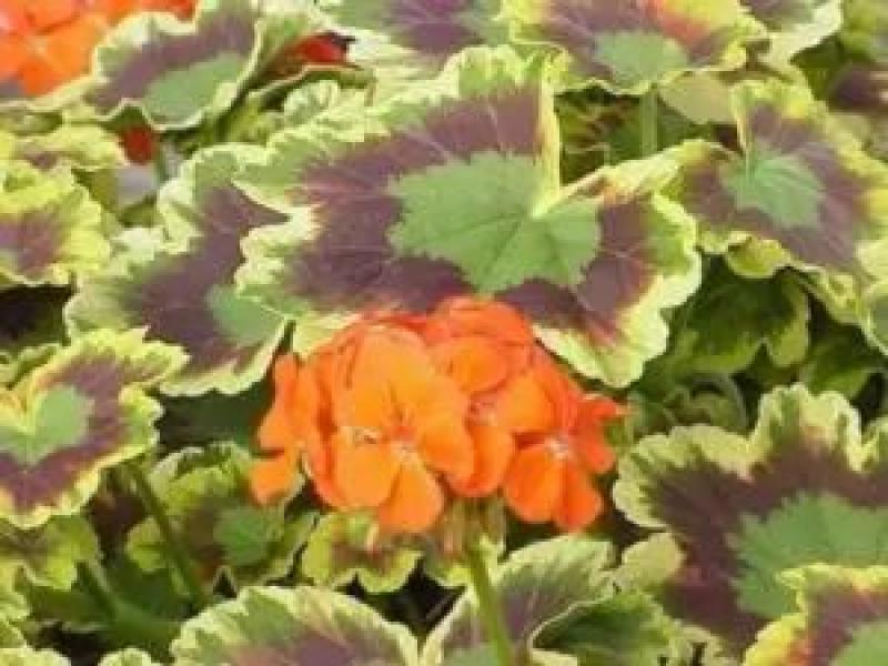 tricolor leaves of rick red, gold and grass green; bright, scarlet red blooms; 12-18"; full sun