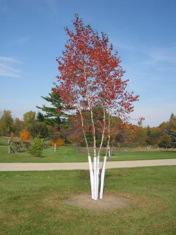 This hybrid European birch, in clump form, has burgundy red foliage and white bark, making for a handsome focal point. It has a graceful, pyramidal, somewhat pendulous habit. Best in normal garden soil and full sun, growing 35-40' tall and 20-25' wide. Hardy to Zone 4. We have a stunning clump of Royal FrostĀ®. planted in our arboretum around the year 2000. It does not drop twigs and branches in the wind the way that river birches do.