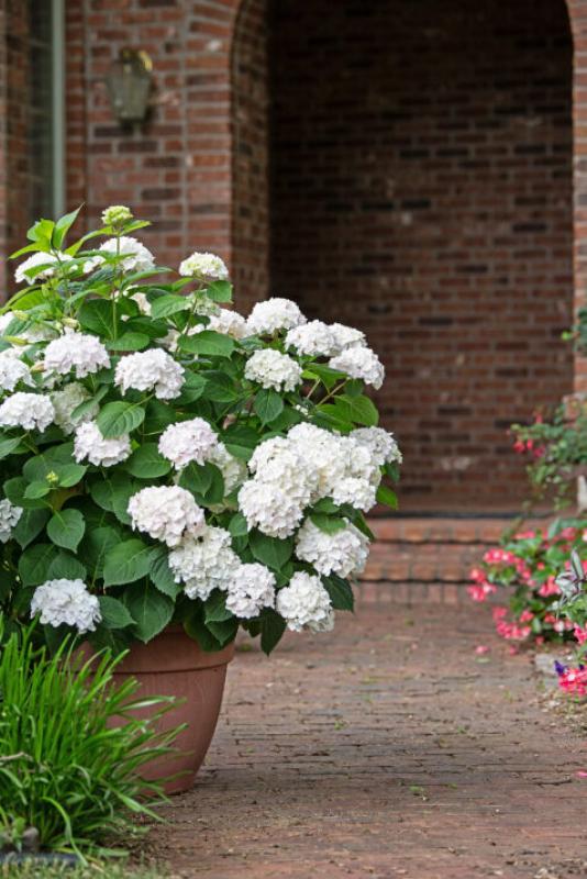 Just as the name suggests, Blushing Bride produces pure white, semi-double flowers which mature to soft pink or Carolina blue, depending on soil pH. The flowers are in the form of big white balls. Great in the garden and perfect as a cut flower and in hydrangea bouquets. Best located in afternoon shade. In order to get early blooms from old wood, dump a bag of mulch in the middle of the plant in November and mound it up to protect some lower buds. Remove the mulch in spring with danger of freeze has passed. Cut the stems back to viable buds in spring. Generally grows 3-4' tall and wide. Hardy to Zone 5.
