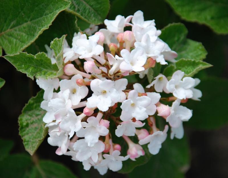A wonderfully fragrant shrub! Pink buds open to clusters of snowball-like white flowers in mid-spring. Unlike some other viburnums, the leaves fully open before the bloom season, offering a fully green backdrop that enhances the beauty of the flowers. Spice Island™ is a compact grower and slow to mature, making it a perfect specimen for garden paths and smaller spaces.  In the fall the foliage turns brilliant shades of burgundy and glowing red. It reaches 4-5' tall and wide and is hardy to Zone 5.