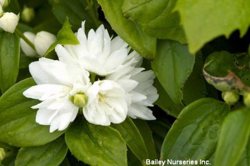 This dwarf mock orange has an upright, compact habit with dark green foliage. It's a prolific bloomer with double white flowers that are extremely fragrant. I does well in full sun to part shade and grows 2-3' tall with a spread of only 1-2'. Hardy to Zone 4.