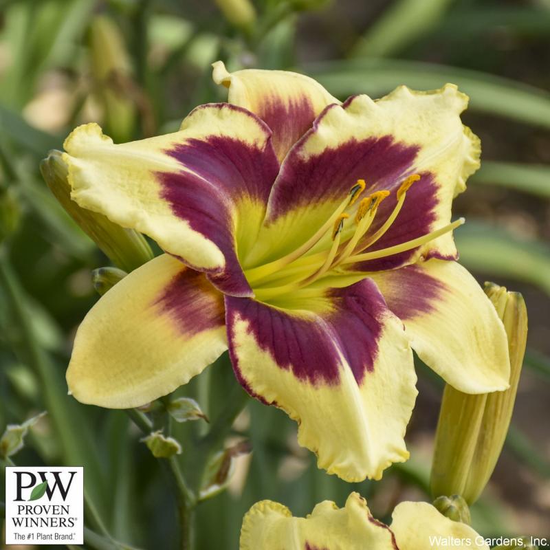 Uniquely shaped, triangular pale yellow petals have a large wine purple eye and a razor thin wine purple edge. A midseason bloomer (July) and a rebloomer, meaning it will produce a second set of flowers.