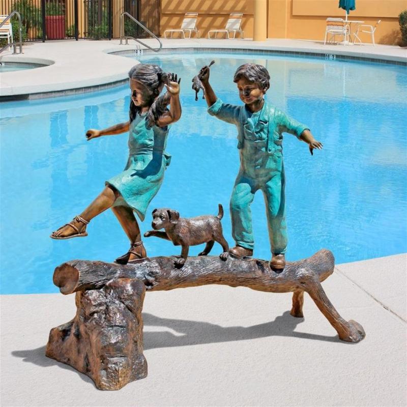 Across the old wooden log with trusty canine and newly-caught frog in tow, this darling duo makes every summer day an adventure! Our impressive and intricately detailed, 360-degree, over-four-and-a-half-foot-tall bronze childhood statue is expertly finished with a hand-applied, classic sepia bronze patina accented by an antiqued emerald verde patina to bring out the amazing detail.