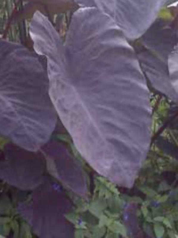 (Taro, Elephant Ear) dark, almost black, arrow shaped leaves can stand up to 3 feet tall; plant in shallow water; easily overwintered indoors as a house plant; Zone 8