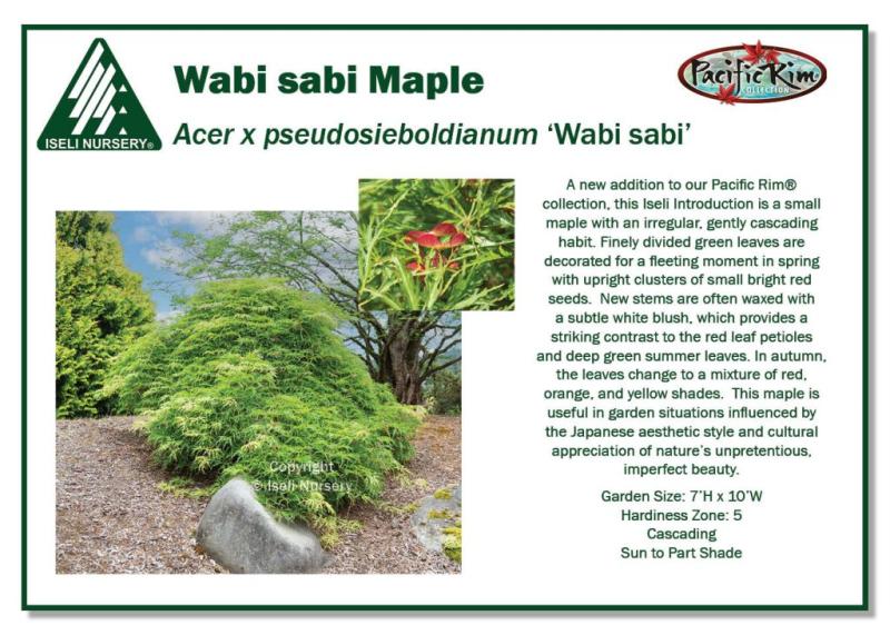 A new addition to the Pacific RimĀ® collection, this Iseli Introduction is a small maple with an irregular, gently cascading habit. Finely divided green leaves are decorated for a fleeting moment in spring with upright clusters of small bright red seeds. New stems are often waxed with a subtle white blush, which provides a striking contrast to the red leaf petioles and deep green summer leaves. In autumn the leaves change to a mixture of red, orange, and yellow shades. This maple is useful in the garden situations influenced by the Japanese aesthetic style and cultural appreciation of nature's unpretentious, imperfect beauty. 'Wabi sabi' grows 8' tall and 10' wide and prefers sun to part shade. Zone 4.