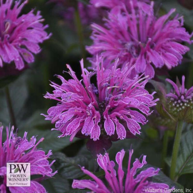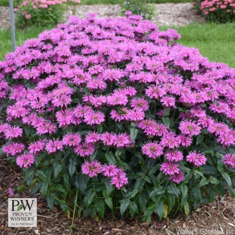 (Bee Balm) dark lavender purple flowers cover the top half of the plant in midsummer; excellent mildew resistance; 22-26 inches; full to part sun; Zone 4