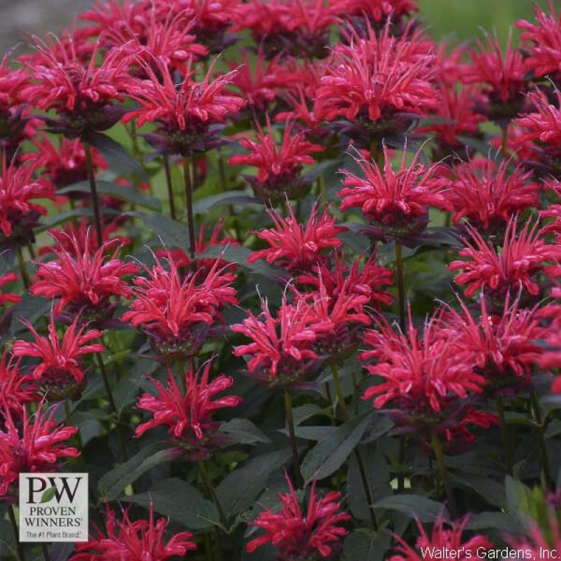 (Bee Balm) large cherry red flowers atop 30in tall foliage; newly emerging foliage has a bronze cast; full to part sun; blooms mid to late summer; Zone 4