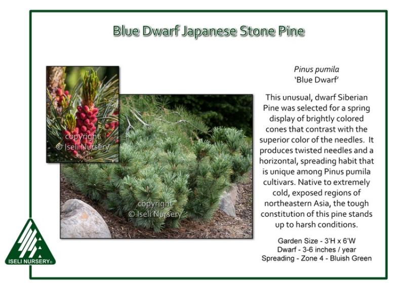 This unusual, dwarf Siberian Pine was selected for a spring display of brightly colored cones that contrast with the superior color of the needles. It produces twisted needles and a horizontal, spreading habit that is unique among Pinus pumila cultivars. Native to extremely cold, exposed regions of northeastern Asia, the tough constitution of this pine stands up to harsh conditions. Garden size is 3' tall and 6' wide in 10 years. Grows in full sun and is hardy to Zone 4.