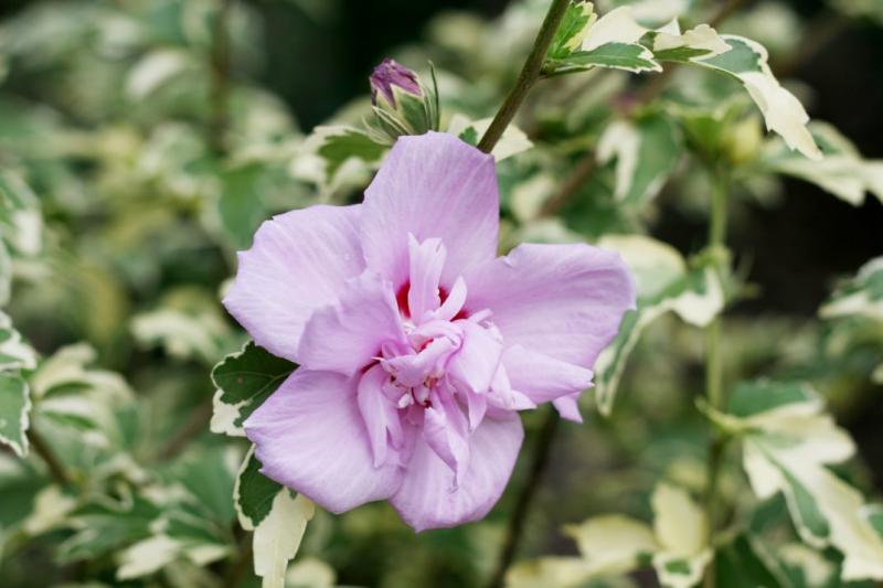 This dwarf Rose of Sharron sports blue/green foliage variegated with creamy white margins. Dark pink to lavender flowers add to the show in summer. At 3-4' in height and width, this is a great feature plant for smaller gardens or in patio containers.