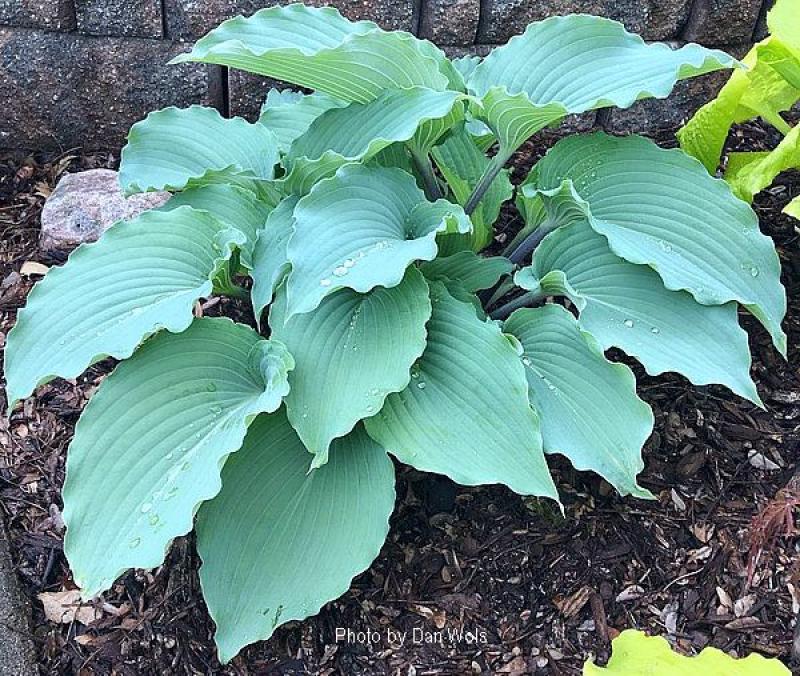 Beautifully ruffled blue leaves are held on bright purple petioles. The backsides of the leaves are white, which is noticeable due to the upright habit and the ruffled leaves. Lavender flowers appear on purple scapes in late summer. Grows 15" tall and 30" wide.
