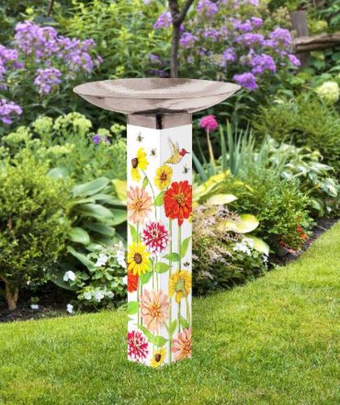 Give birds a place to refresh and rejuvenate with this beautiful Bird Bath Art Poleā¢. Featuring a hand-hammered, polished stainless steel top and a durable, fade-resistant base, it will make a beautiful addition to your garden. No digging required for installation. All hardware included. Proudly made in the USA of US and imported materials.